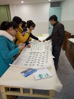 2015年11月25日下午,yl6809永利检测中心书法研习社汤舒静、周凤娇等八名成员成员一同前往十里坊小学向王道林老师学习书法。