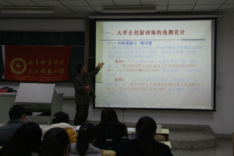 此外,王教授提出了创新训练课题的设计与申报过程中必须遵循价值性原则、科学性原则、创新性原则和可行性原则。王教授提出了选题的聚焦点,希望同学们从热点、关键点、矛盾点、弱点、空白点等方面切入,尽量做到宜小不宜大,宜实不宜虚,宜重不宜轻,立意宜深不宜浅,见地宜新不宜旧。最后,王教授简略的讲述了老员工创新训练课题申报书的撰写与技巧,要求同学们紧扣研究目标不要有重大遗漏,内容表述要明白,不可模棱两可。没有最好的方法,只有最适合的方法,王教授希望通过本次讲座能够提高同学们的创新训练课题的设计与申报的水平。