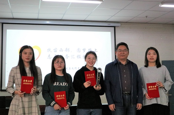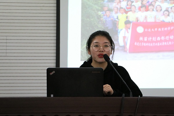 扶苗团队的顾佳言、所方琳、彭利、朱钰四位志愿者进行了“扶苗计划”的成果汇报。她们分别介绍了“扶苗计划”的准备工作、紧张的参赛过程、顶岗实习的感悟和活动的最终总结,展示了一路来的心路历程,也帮助新生们更加深入地了解“扶苗计划”到底是一个什么样的活动。