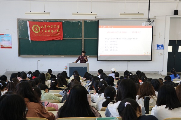 讲座伊始,尤老师给我们讲述了她自己作为幼师的人生经历,并且提出当代幼师要争做“四有教师”的教学理念。从简单剖析当前学前团队状况,同学们了解到现在社会对强化学前教育队伍的迫切要求。关于如何成为四有教师的关键路径,尤老师提出:引导学前专业的员工学习到幼师应具备的素质,以及提升专业技能的方法,从而进一步提高道德情操与教育情怀。同时,尤老师也鼓励在场同学在成为优秀幼师的路上做到自重、自省、自警、自励,热爱儿童、理解儿童。