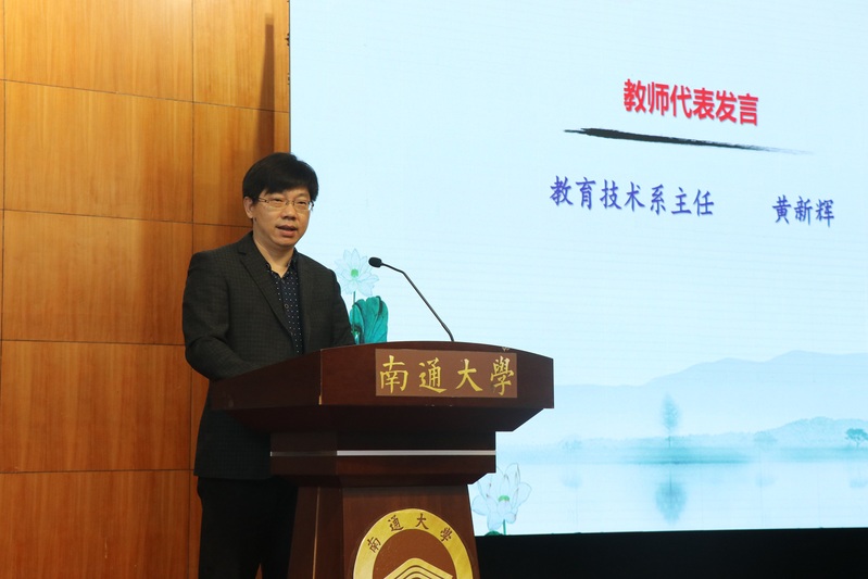 教育技术系主任黄新辉作为教师代表发言,他指出,同学们在大学期间应抱有终身学习的观念,树立清晰明确的人生目标,自律自省,博采众长,为实现自己的人生价值努力奋斗。