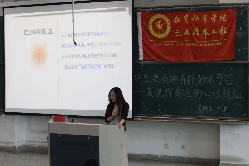 张丽由星座是否与个性紧密相关的问题拉开了讲座的序幕,场景模拟的故事贴近生活,自我评价彰显个性,与此同时,一系列的心理分析让同学们感叹心理学的魅力,而接下来张丽对巴纳姆效应的阐述,则阐释了心理暗示的重要作用,正如著名杂技师肖曼·巴纳姆在评价自己的表演时说,他之所以很受欢迎是因为节目中包含了每个人都喜欢的成分,所以他使得“每一分钟都有人上当受骗”。在日常生活中,“显化”、“向宇宙下订单”等出圈热词也与心理暗示密切相关。看似玄学的种种美好生活实例与心理效应密不可分,而讲座也告诉我们自我肯定的重要力量。