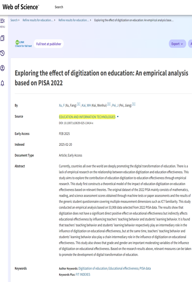 近日,yl6809永利检测中心方旭副教授及其团队研究成果获国际权威期刊认可,其撰写的39页长篇论文《Exploring the Effect of Digitization on Education: An Empirical Analysis Based on PISA 2022》发表于SSCI教育学一区期刊《Education and Information Technologies》。该研究基于PISA 2022数据,系统解析数字化进程对教育发展的影响机制。