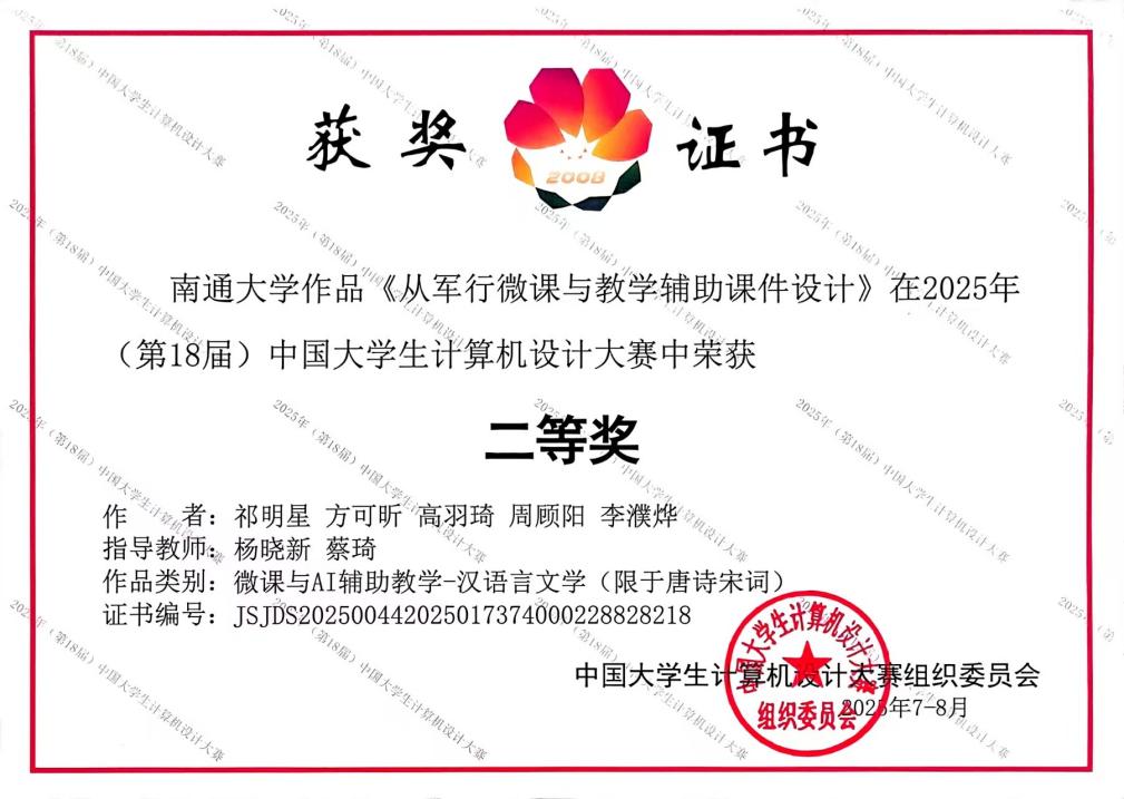 7月25日,2025年(第18届)中国老员工计算机设计大赛在南京大学落下帷幕。由杨晓新、蔡琦两位老师指导的祁明星、方可昕、高羽琦、周顾阳、李濮烨5位同学组队参赛作品《从军行微课与教学辅助课件设计项目》荣获该项大赛二等奖。